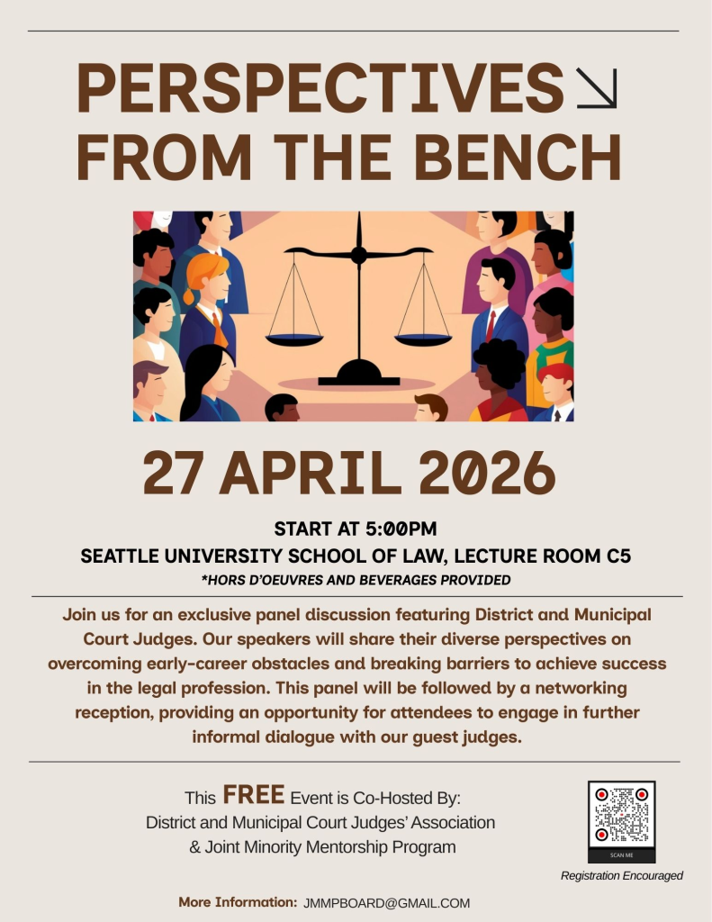REGISTER TODAY for our exclusive panel discussion on April 27, 2026, โ€œPerspectives From the Benchโ€, featuring District and Municipal Court Judges.  Our speakers will share their diverse perspectives on overcoming early-career obstacles and breaking barriers to achieve success in the legal profession. This panel will be followed by a networking reception, providing an opportunity for attendees to engage in further informal dialogue with our guest judges.