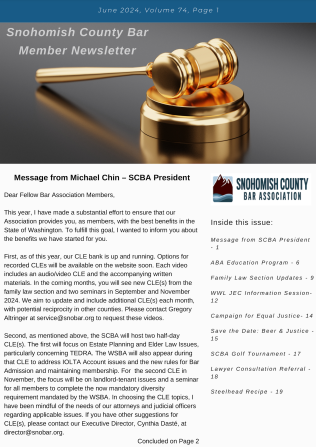 In This Issue Message from SCBA President ABA Education Program Family Law Section Updates WWL JEC Information Session Campaign for Equal Justice Save the Date: Beer & Justice SCBA Golf Tournament Lawyer Consultation Referral Steelhead Recipe SCBA-June-24-Newsletter-1Download previousMay 2024nextJuly 2024