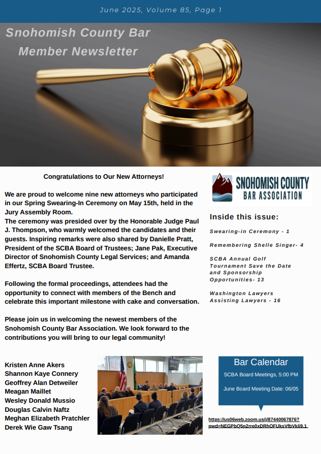 In This Issue Swearing-in Ceremony Remembering Shelle Singer SCBA Annual Golf Tournament Save the Date and Sponsorship Opportunities Washington Lawyers Assisting Lawyers SCBA June 25 Newsletter (2)Download previousMay 2025nextJuly 2025